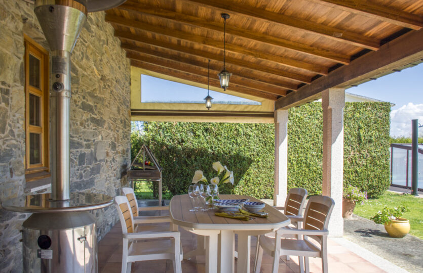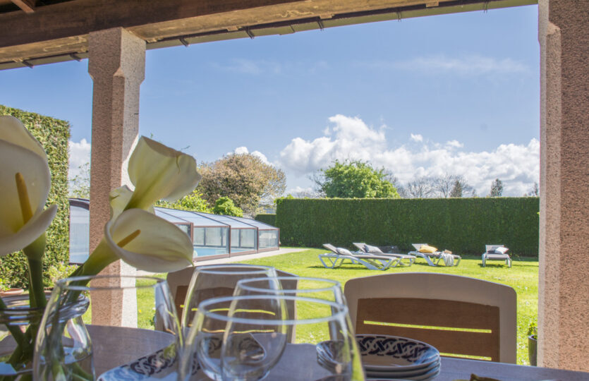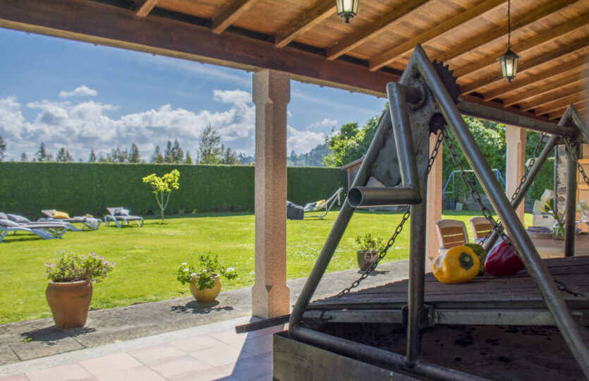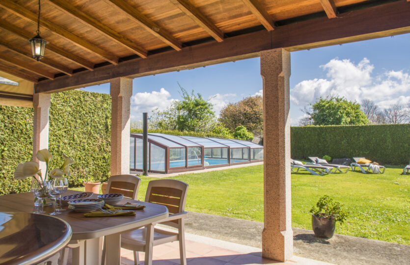 - Y en el exterior, una finca de 1000 metros, cerrada, con un gran porche mirando hacia una parte jardín y hacia la piscina, cubierta para poder usarla durante prácticamente todo el año.